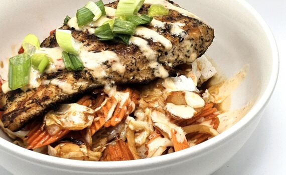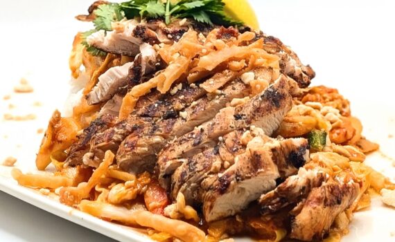 THAI PEANUT CHICKEN STIR FRY // $18.99 citrus marinated grilled chicken breast in house-made thai peanut sauce; served with stir fried vegetables and coconut rice.