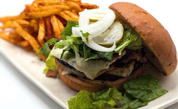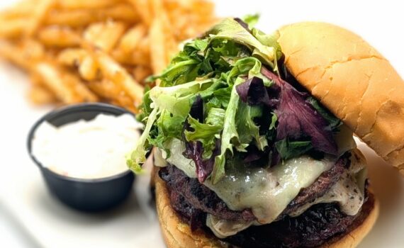 BURGER OF THE MOMENT // $18.99 ROYALE WITH CHEESE | two 1/3 pound wood-grilled patties, topped with american cheese, lettuce, pickle, onion and 1000 island; served with cluck me up! fries. *served medium