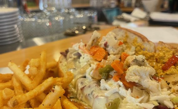 CHICAGO STYLE BEEF SANDWICH // $14.99 slow roasted italian beef topped with house-made giardiniera mix on a hoagie; served with a side of the juice.add cheese | cheddar, american, gouda, swiss, pepperjack, or bleu crumbles | add 1 eachadd caramelized onions | add .50add mushrooms | add .50