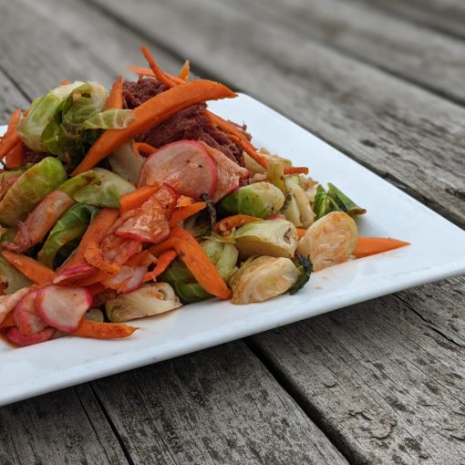spiced corned beef and house special fried rice with kimchi brussels sprouts.