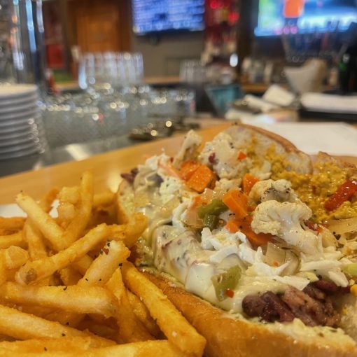 griddled pastrami and ham topped with white american cheese with pesto aioli, hot mustard, house-made giardeniera and coleslaw all on a hoagie.