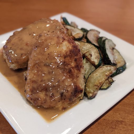 “shake ‘n bake” pan-fried pork chops; served over funeral potatoes with grilled zucchini.