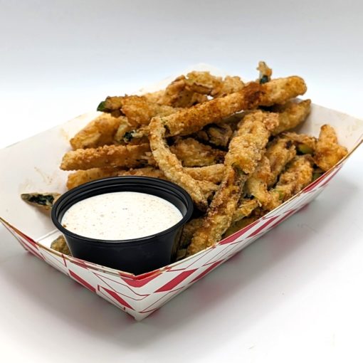 hand-battered zucchini fries, deep fried and served with a side of cayenne ranch for the dipping.