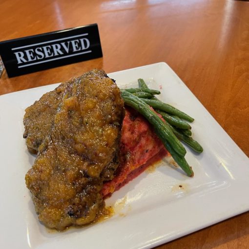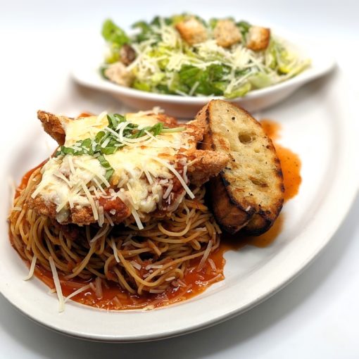 flattened chicken breast tenderloin topped with house-made marinara, parmesan and mozzarella; served over thin spaghetti noodles with grilled ciabatta bread and a […]