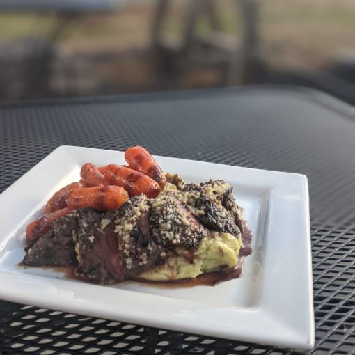 parmesan crusted hanger steak; served with pesto mashed potatoes and lemon green beans.