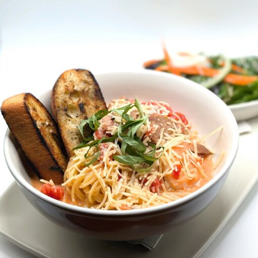 shrimp and sausage sautéed with garlic, tomatoes and basil in a house-made white wine roasted garlic cream sauce with angel hair pasta; […]
