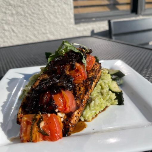 grilled salmon topped with roasted tomatoes, caramelized onions and balsamic reduction; served over shrimp pesto risotto and grilled zucchini.