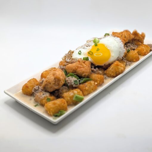 tots and nashville hot chicken nuggets topped with house-made sausage gravy and an sunny side up egg.