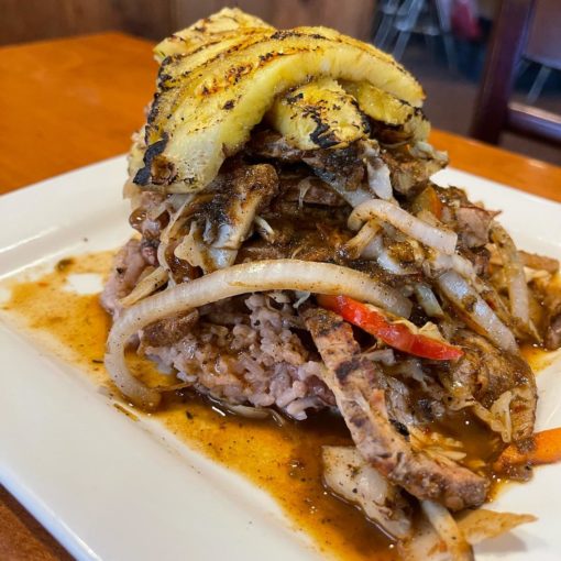 grilled pork loin with sautéed cabbage, carrots, onions and red peppers in spicy jerk sauce; served over rice and peas and topped […]