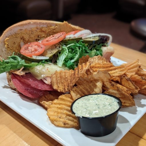salami, turkey and melted pepperjack on a hoagie, topped with house-made dill-french onion dip, hot mustard, house pickles, onions, tomatoes, mixed greens […]