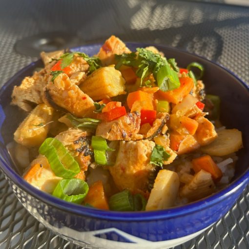 grilled marinated chicken with stir fried vegetables in a house-made thai peanut coconut panang curry sauce; served over jasmine rice.