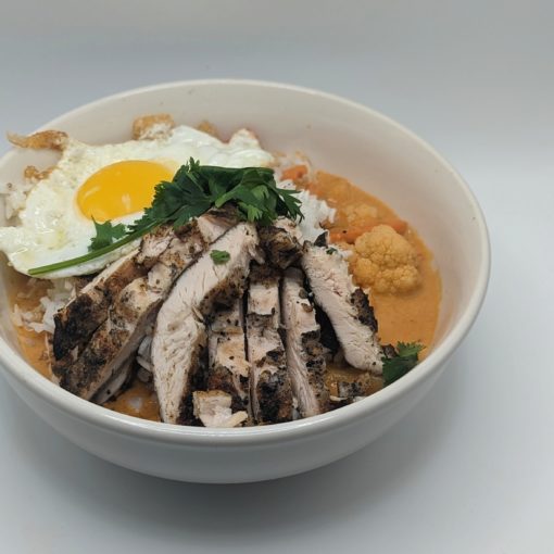 stir-fried vegetables and grilled chicken in a house-made thai peanut curry; topped with cilantro, a sunny side up egg and crushed cashews.